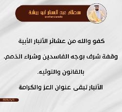 الشيخ سطام أبو ريشة يشيد بموقف أهالي الانبار ضد الفاسدين و"محاولات شراء الذمم"