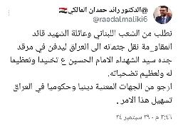 النائب رائد المالكي يطلب موافقة عائلة الأمين العام لحزب الله حسن نصر الله لنقل جثمانه الطاهر الى كربلاء ودفنه فيها.
