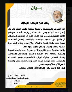 الشيخ همام حمودي يهنيء صاحب العصر والزمان والمراجع العظام والامة الاسلامية بحلول عيد الفطر المبارك