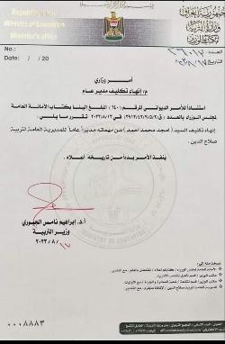بالوثيقة ... وزير التربية يعفي مدير عام تربية صلاح الدين من منصبه