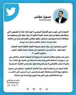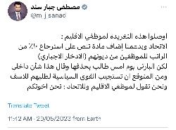 في تغريدة له ... النائب مصطفى سند : ارفقنا في الموازنة فقرة استرجاع 10% من رواتب الموظفين المدخرة لدى الاقليم ولكن الديمقراطي رفض