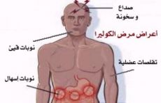 ـ حدوث إسهال شديد غير مصحوب بمغص ولون البراز أولاً أصفر ثم أبيض كلون ماء الأرز وكمية البراز في كل مرة تبرز كبيرة.