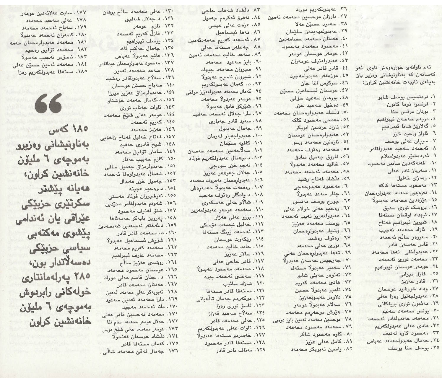 حسب وثيقة نشترها جريدة أوينة الكوردية فأن حكومة أقليم كوردستان قامت بأحالة 185 شخص في الاقليم على التقاعد بصفة وزير من دون أن يكون البعض منهم يوما وزراء، كما أن البعض منهم يتواجدون خارخ الاقليم و يستلم وكلاء عنهم تلك الرواتب التي تبلغ 6 ملايين دينار شهريا و للبعض منهم تصل الى حتى 9 ملايين دينار شهريا. و يستلم هؤلاء شهريا مليار 110 ملايين دينار شهريا من ميزانية حكومة الاقليم.