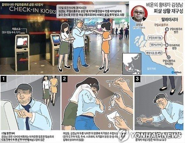 وتبدو الصور غير واضحة لإظهار المشتبه بها الرئيسية، وهي امرأة ترتدي قميصاً أبيض، وبحسب ما ورد فإن “جونغ نام” اغتيل من قبل اثنتين من المشتبه بهنّ من النساء عبر رش السم عليه من الخلف.
