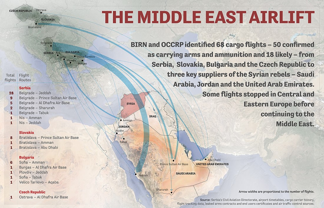 وقد كتبت غايتاندزيفا "قامت السلطات المسؤولة في العديد من البلدان مثل (بلغاريا وصربيا ورومانيا والجمهورية التشيكية وهنغاريا وسلوفاكيا وبولندا وتركيا وألمانيا والمملكة المتحدة واليونان، وما إلى ذلك) بغض الطرف والسماح للرحلات الدبلوماسية بنقل أطنان من الأسلحة عبر الطائرات المدنية لتلبية الاحتياجات العسكرية".