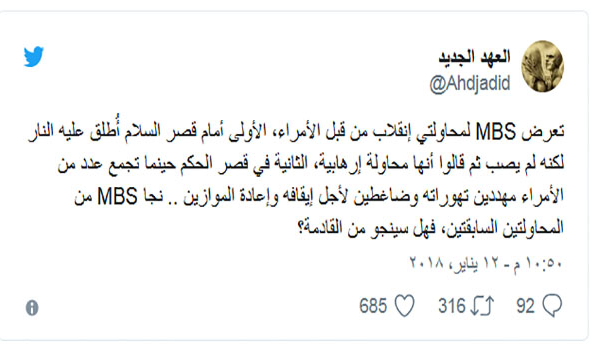 ودون "العهد الجديد" الذي يتابعه أكثر من ربع مليون شخص على تويتر، في تغريدة له ما نصه: "تعرض MBS لمحاولتي انقلاب من قبل الأمراء، الأولى أمام قصر السلام أُطلق عليه النار لكنه لم يصب ثم قالوا أنها محاولة إرهابية".