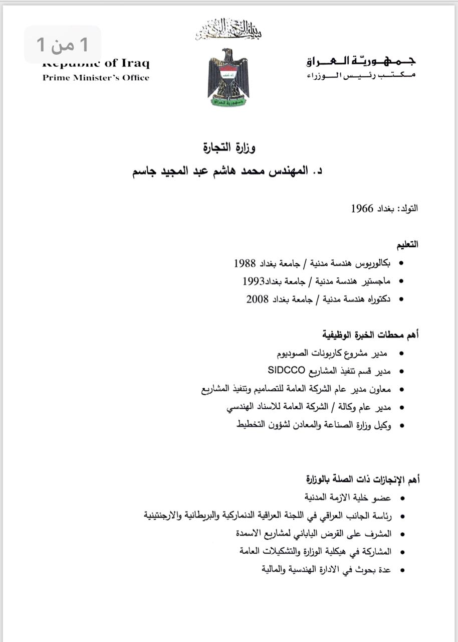 يذكر أنّ البرلمان صوّت بجلسته يوم الأربعاء على عدد من الوزراء من بينهم وزير التجارة د. المهندس محمد هاشم عبد المجيد جاسم الحائز دكتوراه هندسة مدنية