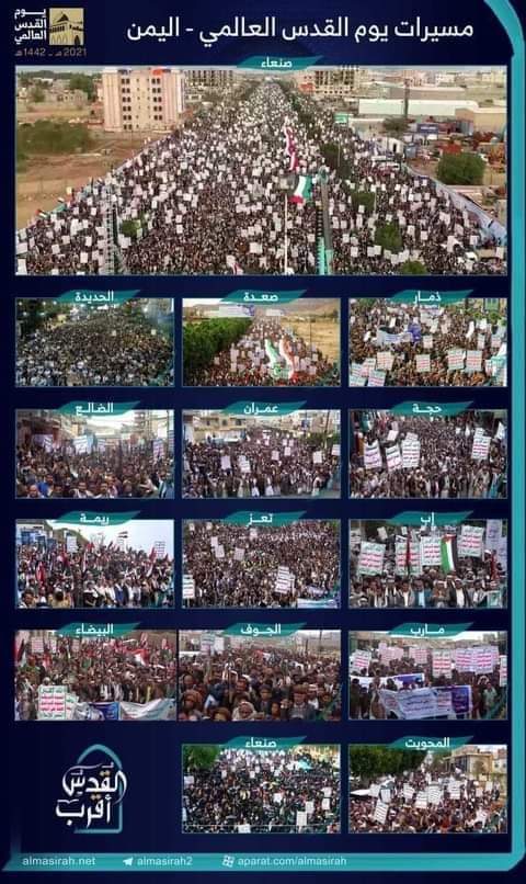 الامام الخميني سلام الله عليه اسس يوم القدس العالم في اواخر شهر رمضان لحرف البوصله نحو القدس ومن اجل العالم العربي والاسلامي يهتم بالقضية المركزية فلسطين حتى يتم تحرير فلسطين من الكيان الصهيوني الغاصب يومنا هذا الجمعة العاصمة السياسية صنعاء وكل عواصم المحافظات التي تحت الحصار خرجت في مسيرات مليونية رفعت الشعارات والاعلام بالتضامن مع القدس والقضية المركزية فلسطين وتم قراءة بيان المحتجين يدين ويشجب ويستنكر الاعتداء الغاشم من قبل الصهاينة على غزه وعلى ابطال المقاومة وعلى سوريا كذلك الضاحية الجنوبية في لبنان خرجت في مسيرات من حزب الله ومن النساء والاطفال والشيوخ تحيي يوم القدس والقئ كلمة سيد المقاومه حفيد الرسول الاعظم السيد حسن ن ص ر الله امين عام حزب الله بهذه المناسبه وايضا خرجت مسيرات في ايران وفلسطين وسورياء والعراق دول الممانعة كذلك سوف تعقد مؤتمرات وندوات من قبل كتاب ومفكرين وقيادات سياسية من دول محور المقاومة لايصال رسالة للعالم ان القدس قضيتنا المركزية ولابد من تحرير القدس من الكيان الصهيوني الغاصب ومن اجل احياء الثورات لدى شعوب واحرار العالم من اجل افشال المشاريع الامريكية في المنطقة وتحرير المقدسات كما نتمنى من المسيرات المليونية التي سوف تخرج في دول محور المقاومة رفع شعارات اليمن والتنديد والشجب والاستنكار على العدوان العالمي التي تشنها الادارة الامريكية وادواتهم في الشرق الاوسط والخليج على يمن الحضارة والتاريخ ولابد من الامة ان تستشعر بالمسؤلية ازاء ما يتعرض له اليمن من حصار مطبق وحرب كونية منذ ست سنوات بدون وجه حق لان اليمن هو في مواجهه مع قوى الاستكبار وهو يدافع عن الامة العربية والاسلامية من اجل نيل التحرر والاستقلال وتحرير المقدسات وافشال المشاريع الامريكية من اليمن سيتم صنع عملية تحول في اليمن وفي دول الاقليم والعالم نحن على ثقه ان النصر حليف اليمن لانه مستقوي بالله تعالى ويتخذ من الامام الحسين عليه السلام مصدر الهام ومن يتخذ الامام الحسين مصدر الهام لايعرف الهزيمة اطلاقا اليمن سينتصر وهزيمة كبرى ومدوية لقوى الاستكبار العالمي هذا والعاقبة للمتقين