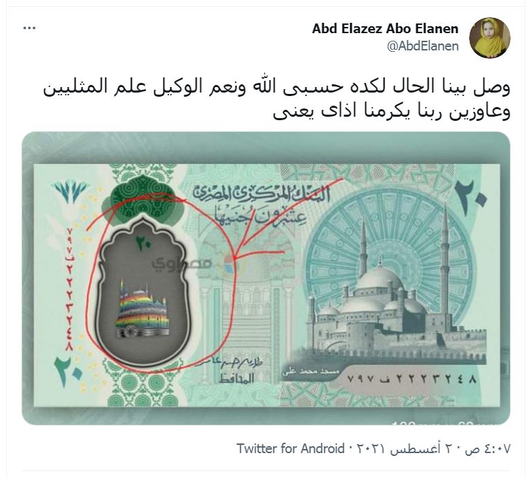 ونشر حساب "تونس 365" تغريدة جاء فيها "فضيحة جديدة تهز مصر: وضع علم المثليين على رسم مسجد محمد على في عملة جديدة من فئة عذرين جنيه.. ومازال يستفز مشاعر المسلمين الى ياتي وعد الله فيه #منقول".