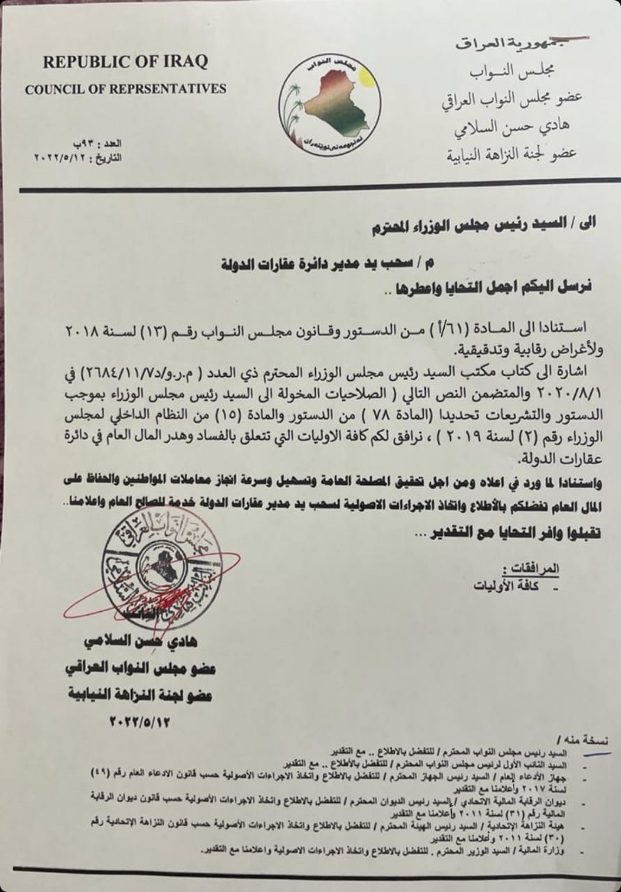 وقال السلامي بحسب وثيقة ا،: " استنادا الى المادة (61/أ) من الدستور وقانون مجلس النوابرقم (13) لسنة 2018 ولاغراض رقابية وتدقيقية، اشارة الى كتاب مكتب رئيس مجلس الوزراء المتضمن " الصلاحيات المخولة لرئيس مجلس الوزراء بموجب الدستور والتشريعات تحديدا المادة (78) من الدستور والمادة (15) من النظام الداخلي لمجلس الوزراء رقم (2) لسنة 2019 نرفق لكم كافة الاوليات التي تتعلق بالفساد وهدر المال العام في دائرة عقارات الدولة".