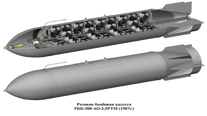 ومن أحدث الذخائر العنقودية في حوزة الجيش الروسي قنبلة "دريل" ( المثقاب) بوزن 540 كلغ، وتتضمن القنبلة 15 ذخيرة صغيرة الحجم توجّه ذاتيا وتخصص لتدمير المدرعات والمنشآت الهندسية المحصنة والرادارات ووسائل الدفاع الجوي ومراكز القيادة، ومن مميزات القنبلة تزويد مكوناتها بنظام التعرف على الصديق والغريب. ويمكن أن تنفصل القنبلة عن جسم الطائرة التي تحملها على مسافة 30 كلم من الهدف المراد تدميره وتحوم في الجو بناء على إشارة "غلوناس" للملاحة الفضائية. ولكل عنصر في القنبلة رأس يجاوب مع الأشعة تحت الحمراء أو الرادارية الموجهة ذاتيا، ما يكفي لتدمير أية مدرعة ومنشآة خرسانية، لا سيما مدارج المطارات.