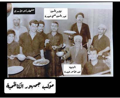 قدر(التمن عنبر بالزعفران )علی النار(يتهدر)ورائحته زكية مختلفة، والقيمة الكظماوية صارت جاهزة(مدروخة تماما) وصوت(ياحسين بضمايرنا)منخفض جدا في داخل البيت،ووجيراننا المسيحية تأتي لتخلط القدر وتطلب(المراد) وأمي تدعو:ربي،لاتگطع لنا عادة،كل سنة وكل عام نطبخ!