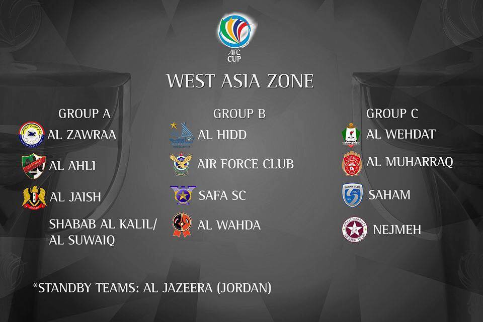 جرت صباح اليوم قرعة كأس الاتحاد الآسيوي لكرة القدم في مدينة سيلانغور الماليزية بفندق هيلتون بيتالينغ جايا و أسفرت وقائع قرعة أندية دول غرب آسيا عن وقوع نادي الزوراء على رأس المجموعة الأولى فيما أوقت القوة الجوية في المجموعة الثانية.