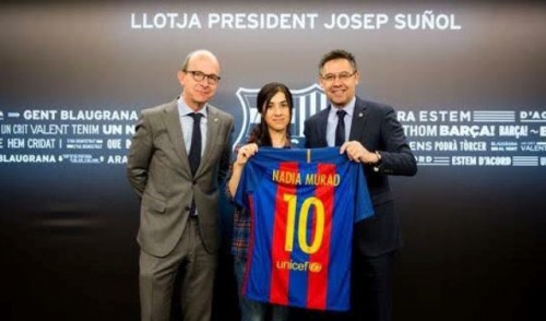 منح نادي برشلونة الإسباني قميصا للعراقية الإيزيدية نادية مراد إحدى سفيرات الأمم المتحدة للنوايا الحسنة، وأبرز الناجيات من الاستعباد الجنسي على يد تنظيم "داعش".