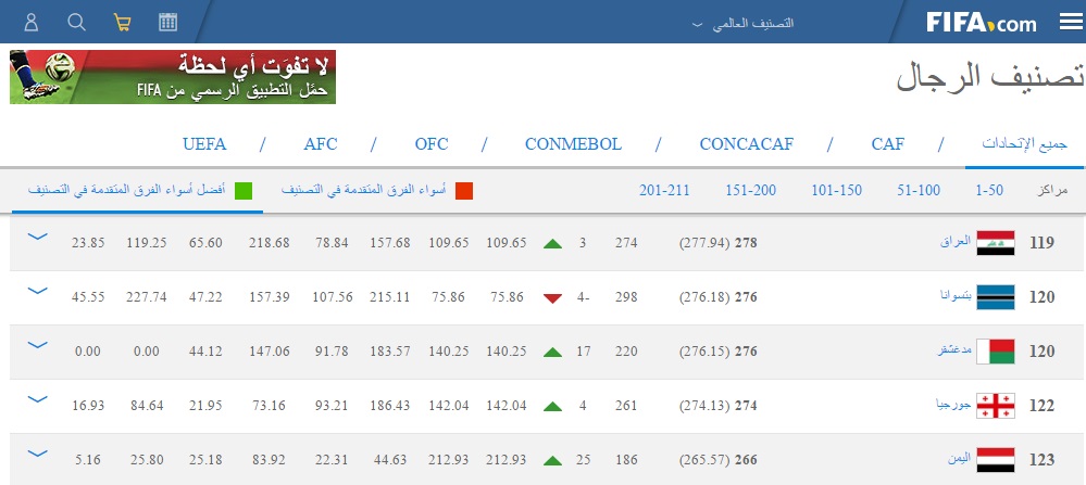 وشهد التصنيف الذي أصدره الاتحاد الدولي لكرة القدم، تقدم المنتخب الوطني نحو الترتيب 119، بعد ان احتل الترتيب 122 في تصنيف شهر آذار الماضي، وتصدر المنتخب البرازيلي التصنيف بعد أن تراجع المنتخب الارجنتيني إلى المرمز الثاني فيما جاءت ألمانيا ثالثا في الترتيب.