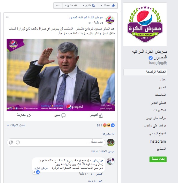 اثار تصريح رئيس الاتحاد العراقي لكرة القدم عبد الخالق مسعود استغراب وغضب الجماهير الرياضية حين فضل ان يلعب المنتخب الوطني في الخارج بدلا من الملاعب العراقية لكي لا تستفيد وزارة الشباب والرياضة من مبالغ ايجار الملاعب وايجار ملاعب خارج البلاد.