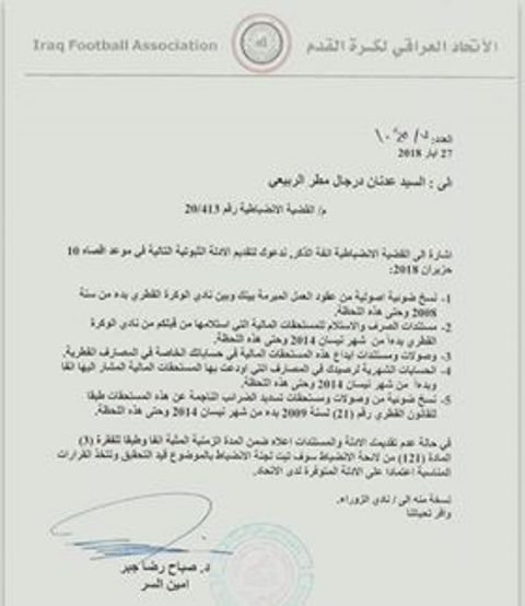 طالبت لجنة الانضباط في اتحاد الكرة، النجم الدولي السابق عدنان درجال، بخمسة ادلة ثبوتية بموعد اقصاه الـ10 من حزيران المقبل، فيما هددت بالبت في قضية تزوير الاوراق التي رفعها الاتحاد ضده واتخاذ القرارات اللازمة بحقه.
