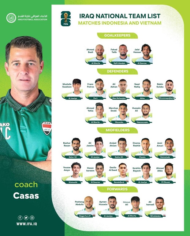 أعلن الجهازُ الفنيّ للمُنتخبِ الوطنيّ استدعاءَ (25) لاعباً لمواجهة منتخبي إندونيسيا وفيتنام ضمن التصفياتِ المزدوجة المؤهلة لنهائياتِ كأس العالم 2026 وكأس آسيا 2027 .