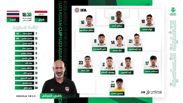 أعلن الكابتن راضي شنيشل عن تشكيلةُ منتخبنا الأولمبيّ لمُواجهةِ نظيره التايلاندي مساء اليوم الثلاثاء ضمن الجولةِ الأولى لمُنافساتِ المجموعة الثالثة لنهائياتِ كأس آسيا لمنتخبات دون 23 عاماً والتي تحتضنها دولةُ قطر والمؤهلة لدورةِ الألعاب الأولمبية في باريس.