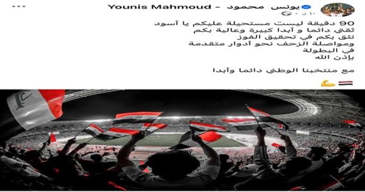 وكتب محمود ، عبر حسابه الشخصي في مواقع التواصل الاجتماعي، " 90 دقيقة ليست مستحيلة عليكم يا أسود.. ثقتي دائما و أبدا كبيرة وعالية بكم ، نثق بكم في تحقيق الفوز ومواصلة الزحف نحو أدوار متقدمة في البطولة بإذن الله ..مع منتخبنا الوطني دائما وأبدا "