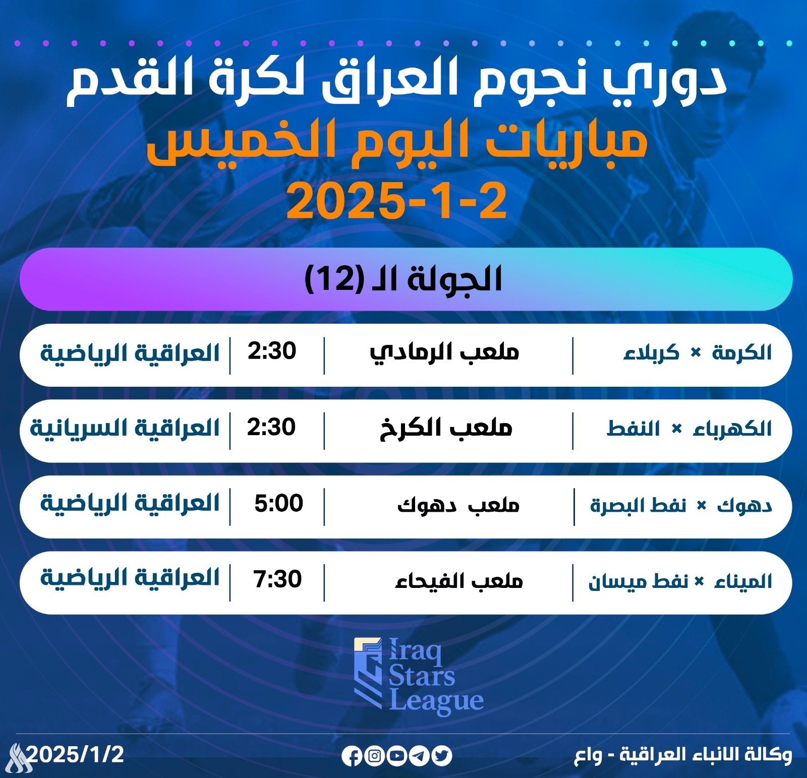 تبدأ اليوم الخميس، منافسات الجولة الثانية عشرة، لدوري نجوم العراق لكرة القدم، بعد أن توقف في الفترة الماضية بسبب مشاركة المنتخب العراقي في منافسات بطولة كأس الخليج العربي (خليجي 26)، إذ تقام اليوم الخميس، أربع مباريات، حيث يلتقي النفط، صاحب المركز الثالث في جدول الترتيب برصيد 19 نقطة، الكهرباء الذي يتواجد في المركز الحادي عشر برصيد 14 نقطة، كما يلعب الكرمة، صاحب المركز الثالث عشر، على ملعبه مع كربلاء، صاحب المركز الثاني عشر.