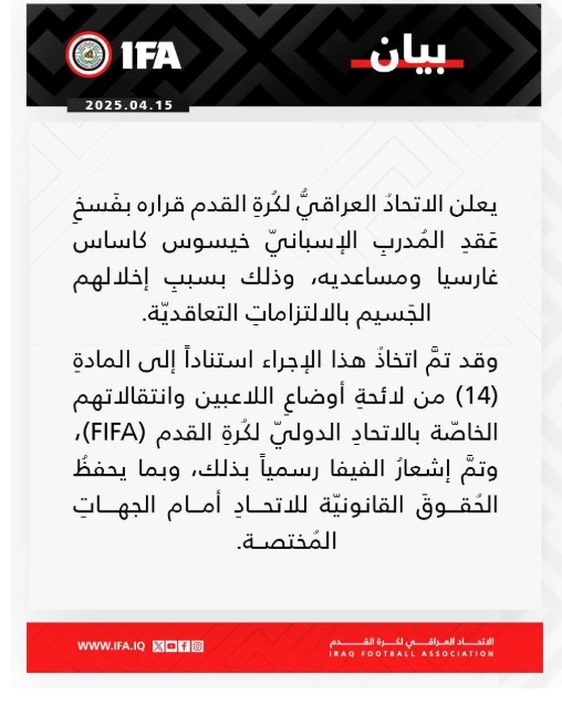 وذكر الاتحادُ في بيان "نعلن قرارنا بفَسخِ عَقدِ المُدربِ الإسبانيّ خيسوس كاساس غارسيا ومساعديه، وذلك بسببِ إخلالهم الجَسيم بالالتزاماتِ التعاقديّة".