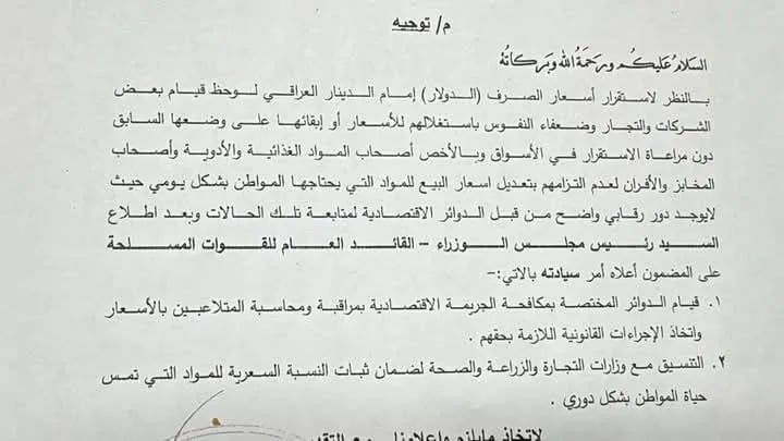 وبحسب وثيقة صادرة من مكتب السوداني انه "بالنظر لاستقرار أسعار الصرف (الدولار) أمام الدينار العراقي، لوحظ قيام بعض الشركات والتجار وضعفاء النفوس باستغلالهم للأسعار أو إبقائها على وضعها السابق دون مراعاة الاستقرار في الأسواق وبالأخص أصحاب المواد الغذائية والأدوية وأصحاب المخابز والأفران، لعدم التزامهم بتعديل أسعار البيع للمواد التي يحتاجها المواطن بشكل يومي حيث لا يوجد دور رقابي واضح من قبل الدوائر الاقتصادية لمتابعة تلك الحالات".