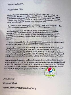 نص رسالة رئيس الوزراء الدكتور حيدر العبادي الى رئيس الاتحاد الدولي لكرة القدم
