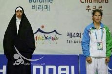بطلة جودو ايرانية تصر على صعودها لمنصة التتويج في كوريا بعباءتها الاسلامية