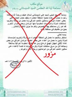 مكتب الإمام المفدى السيد السيستاني ينفي اصداره بيان بخصوص ماجرى بالمنطقة الخضراء والبيان المنسوب للمرجعية مزور
