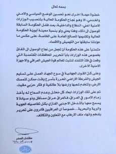 السيد مقتدى الصدر في بيان له: نحن على اتم الاستعداد لتسليم المناطق المحررة للجيش العراقي خلال 15 يوما