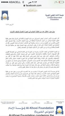 مؤسسة الامام الخوئي في لندن تستنكر الاعتداء الاثم على طلبة الحوزة العلمية في النجف الاشرف