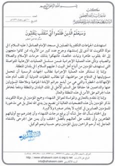 مكتب المرجع الكبير السيد محمد سعيد الحكيم يصدر بيانا يستنكر فيه استهداف الجماعات التكفيرية المصلين بمسجد الصادق(ع) في الكويت