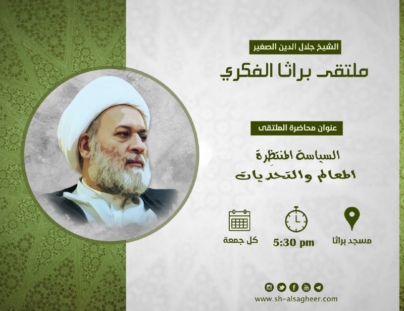 يلقي المحاضرة سماحة الشيخ جلال الدين الصغير في مسجد براثا والدعوة عامة للجميع.