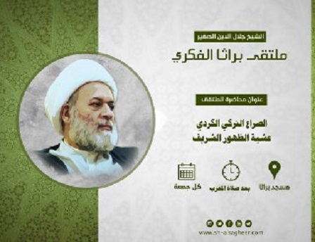 محاضرة ملتقى براثا الفكري عنوان المحاضرة: الصراع التركي الكردي عشية الظهور الشريف موعد المحاضرة: الجمعة بعد صلاة المغرب والعشاء مكان انعقاد المحاضرة: مسجد براثا المحاضر: سماحة الشيخ جلال الدين الصغير الدعوة عامة للجميع ..