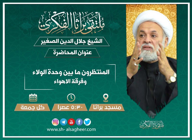 المنتظرون ما بين وحدة الولاء التي يدعو لها التدين وشرعة آل محمد صلوات الله عليهم وما بين فرقة الاهواء التي تغذيها اجندات ظالمة بنت نفسها على معيار فرق تسد هذا هو موضوع محاضرة يوم غد الجمعة في ملتقى براثا الفكري والذي ينعقد في جامع براثا في الساعة الخامسة عصرا والدعوة عامة للجميع