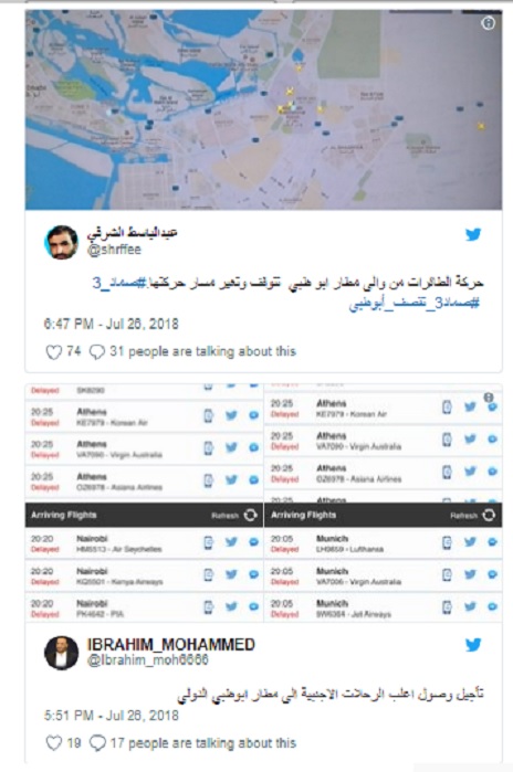 كما تداول نشطاء مجموعة من الصور، تظهر إعلان مطار أبو ظبي، عن تعطيل عدد من رحلاته الجوية من وإلى مطار أبو ظبي.