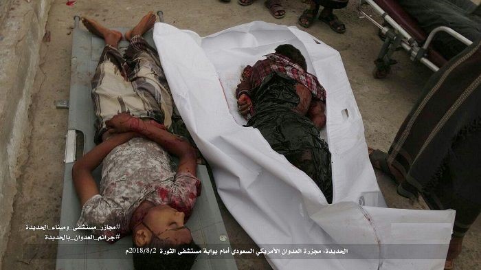 قال مدير مكتب الصحة بمحافظة الحديدة، الدكتور عبد الرحمن الجارالله، إن جثامين 42 شهيد وصلت إلى مستشفى الثورة و المستشفيات الأخرى بمدينة الحديدة، إثر مجزرتي طيران التحالف السعودي، الخميس 2 أغسطس/آب 2018، أمام بوابة مستشفى الثورة و حراج السمك بمدينة الحديدة.