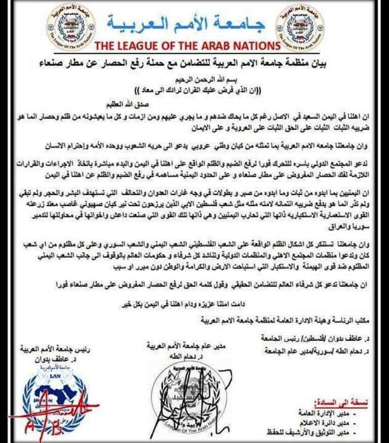 ندعو المجتمع الدولي باسره للتحرك فورا لرفع الضيم والظلم الواقع على اهلنا في اليمن والبدء مباشرة باتخاذ الاجراءات والقرارات اللازمه لفك الحصار المفروض على مطار صنعاء و على الحدود اليمنيه مساهمه في رفع الضيم والظلم عن اهلنا في اليمن
