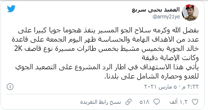 أكد المتحدث باسم قوات الحوثيين، يحيى سريع، على حسابه في "تويتر"، أن المجاهدين الحوثيين شنوا ظهر اليوم "هجوما جويا كبيرا" بواسطة خمس طائرات مسيرة من نوع "قاصف 2K" على "عدد من الاهداف الهامة والحساسة " في قاعدة الملك خالد الجوية الواقعة في خميس مشيط، مضيفا: "كانت الإصابة دقيقة".