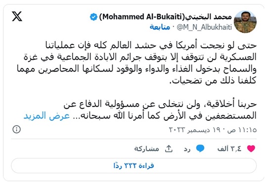وقال البخيتي عبر منصة "إكس": "حتى لو نجحت أمريكا في حشد العالم كله فإن عملياتنا العسكرية لن تتوقف إلا بتوقف جرائم الإبادة الجماعية في غزة والسماح بدخول الغذاء والدواء والوقود لسكانها المحاصرين مهما كلفنا ذلك من تضحيات".